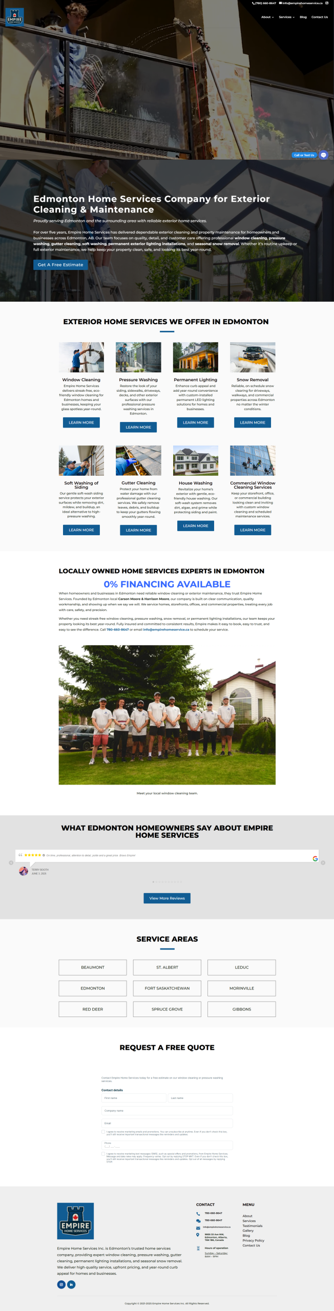 In owner Carson Moore’s own words, this new website “blows our competitors’ websites out of the water.” The clean layout, sharp visuals, and user-friendly structure make it easy for homeowners and businesses to quickly see why Empire is the clear choice for window cleaning, pressure washing, LED lighting, and snow removal.